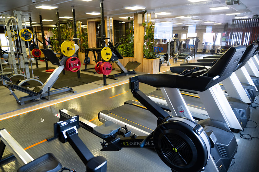 Dette er styrkeområdet med fokus på frivekter. Her finner du manualer, benker, smith-maskin, 5-stack kabeltrekk, to knebøy-stativ, T-bar og nedtrekk-maskin.